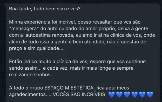 Ambiente Acolhedor: Criamos um ambiente acolhedor e profissional em nossa clínica, onde você se sentirá confortável e relaxado durante seus procedimentos, proporcionando uma experiência positiva e gratificante.